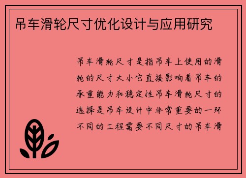 吊车滑轮尺寸是指吊车上使用的滑轮的尺寸大小,它直接影响着吊车的承重能力和稳定性。吊车滑轮尺寸的选择是吊车设计中非常重要的一环,不同的工程需要不同尺寸的吊车滑轮来满足其需求。我们将详细介绍吊车滑轮尺寸的相关知识,希望能够引起读者的兴趣,并为他们提供一些背景信息。